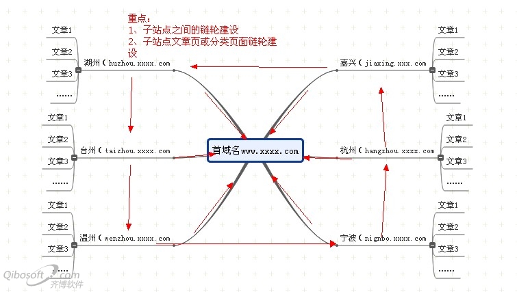 此方法有些类似行网建站策略。以某整形医院为例:www.xxxx.com.下设各个地区的子域名网站,如ningbo.xxxx.com (title:宁波整形医院)、hangzhou.xxxx.com (title:杭州整形美容医院)、wenzhou.xxxx.com …… 同时结合文章页-子页面链轮方式,提升子域名权重,通过子域名建设链轮指向首域名。此做法使得整站权重得到有效提升的同时大大增强了整站主题内容的相关性,对于行业的各大长尾词和热门关键词排名都有受益良多。对于此链轮的操作层面上的也不在过多的加以解释。经过本人验证总结的实现方式草图如下: