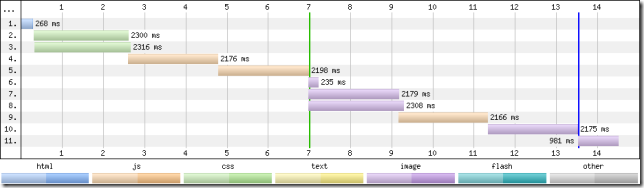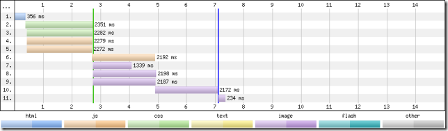 下面这个瀑布流是使用IE8打开链接中网页的结果,性能有显著的提升:IE8=7S > IE7=14S。
