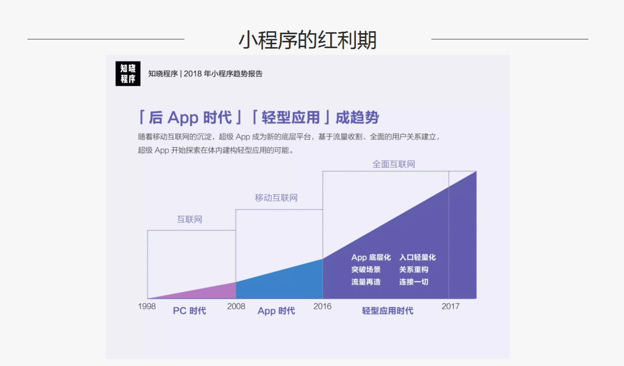 现在是属于“轻应用时代”,这一趋势会随着微信小程序的拓展,变得更加清晰。「轻型应用」是互联网下一次机会浪潮的开端,但较之于此前的移动互联网时代,这个领域的变革不再只由硬件和系统级厂商所主导,头部的 App 巨头扮演着更为积极与重要的角色。