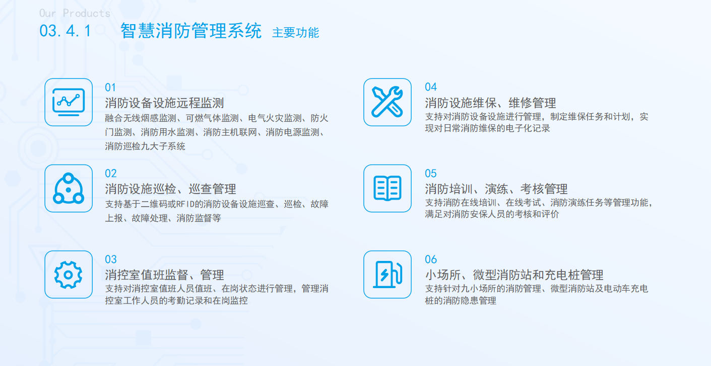 1.全面物联,实时感知:融合多类传感器与子系统,打破信息孤岛,实现消防要素全时段监控。