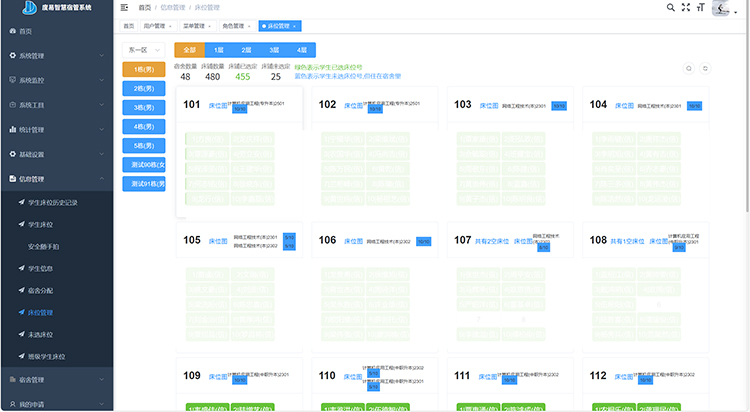 智能分配:按性别、年级、专业、学号自动分配床位;支持特殊申请(调换、休学、走读)在线审批。