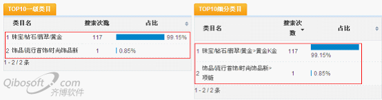 由图上可以看出宝贝类目是黄金/黄金,搜索18k白金项链总搜索量是117,宝贝类目是项链时,搜索18k白金项链总搜索量是1。