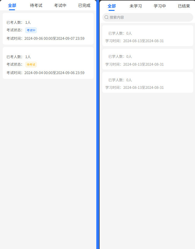 考试列表与状态:员工可看到所有待参加的考试,包括考试名称、起止时间、时长、总分、及格线等。状态分为“未开始”、“进行中”、“已结束”。